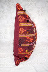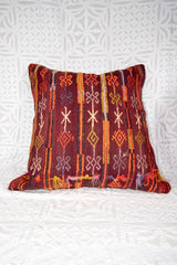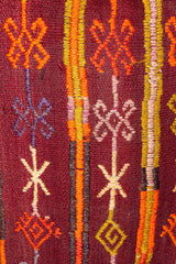 Made from a vintage Turkish kilim, called a cicim (pronounced jeejeem) - this bright and colorful pillow has intricate patterns in purples, orange and red - and includes tufts of full shearings of Anatolian wool - called tulu - sewn in.