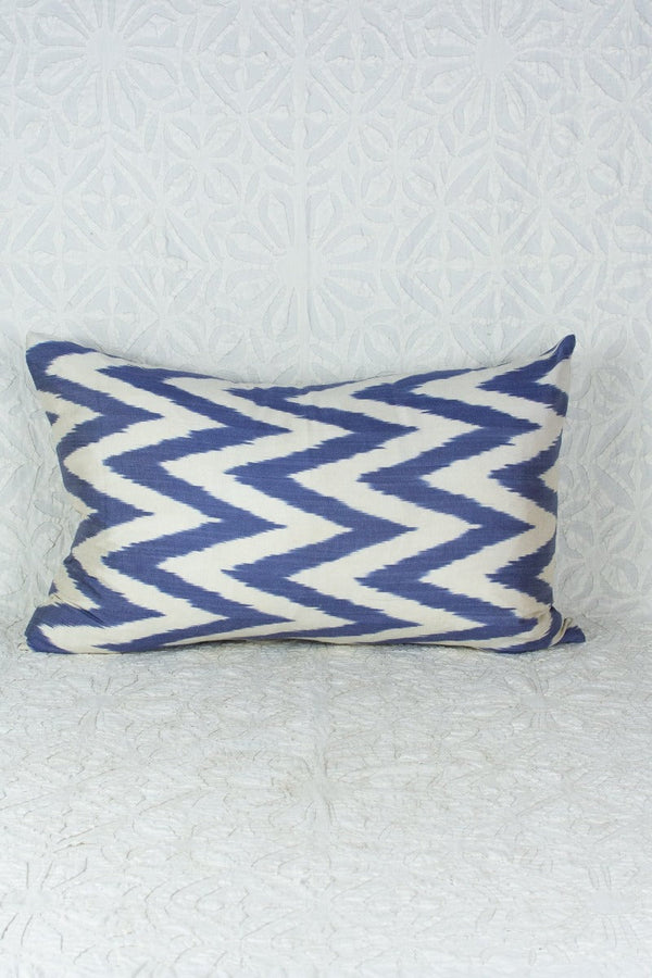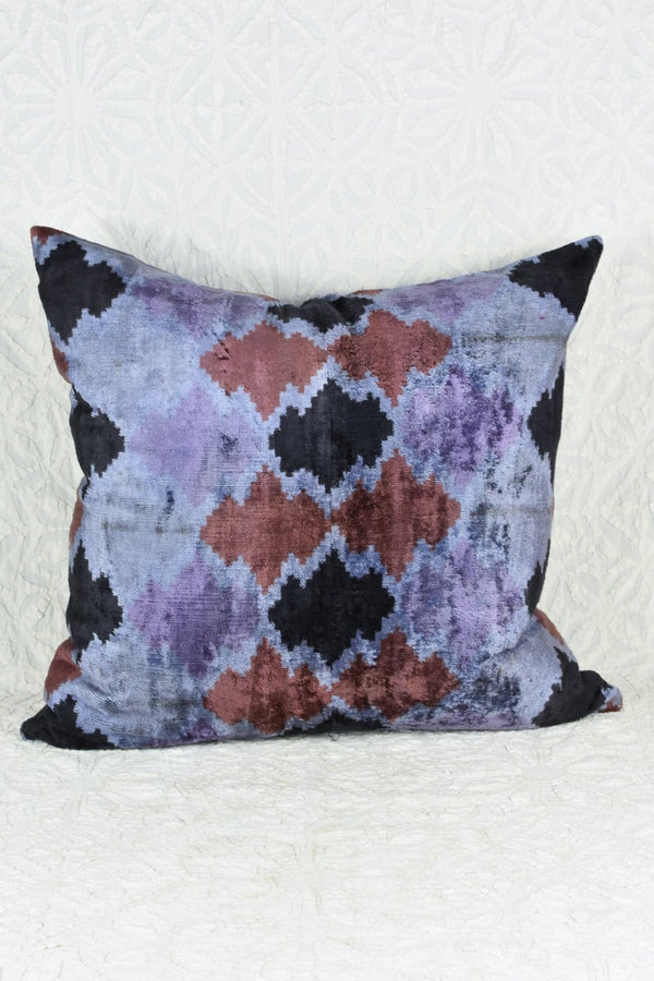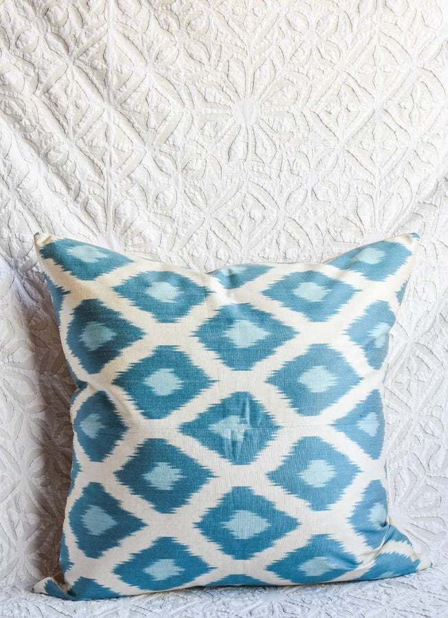 Silk ikat is an incredibly labor intense textile process from Central Asia.  The warp is hand tied to resist dye in places, creating the pattern that is revealed in the weaving process.  Luxurious silk threads are used for a soft, sumptuous feel.  The additional work of hand cutting each thread to make the silk velvet on these adds yet another level of beauty to these pillows.  The reverse is a neutral cotton, hidden zipper at the back.  Deep indigo and lighter blue polka dot fun!