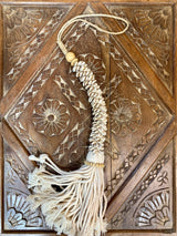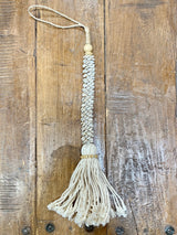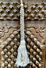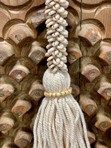These shell tassels have row after row of hand tied cowrie shells, and blond wooden beads, all ending in a jaunty cotton tassel.