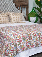 This block printed bedcover is buttery soft and sprinkled with the most beautiful floral bouquets. Block printing is an age old technique perfected in Jaipur, India. Each color design in this fabric is created with a hand carved wooden stamp. Yardage is stretched out on long padded tables and the pattern is stamped by hand onto the cotton fabric. Running hand stitches finish these bedcovers with alternate thread colors.