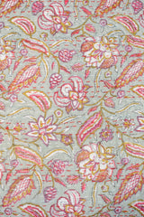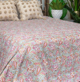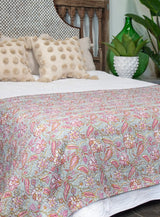 This block printed bedcover is buttery soft and sprinkled with the most beautiful floral bouquets. Block printing is an age old technique perfected in Jaipur, India. Each color design in this fabric is created with a hand carved wooden stamp. Yardage is stretched out on long padded tables and the pattern is stamped by hand onto the cotton fabric. Running hand stitches finish these bedcovers with alternate thread colors.