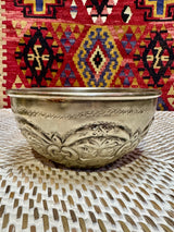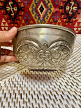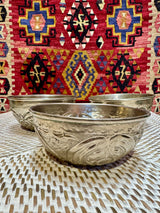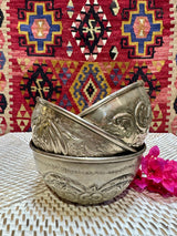 These decorative bowls were used in traditional hammams throughout Morocco, they are made of a special metal called melchior which is a non-tarnishing silver toned metal. These bowls would have been used to splash cooling water when in the steam rooms of the baths.