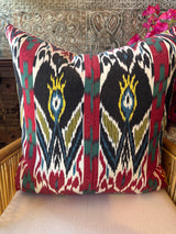 Soft silk thread is painstakingly bound and dyed before being handwoven on slender looms in Uzbekistan to create these colorful and complex pillows. Each time the color changes there was a whole additional round of tying and dying the silk threads. It's an amazing process that produces the most glorious pillows!