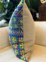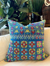 This vivid blue, embroidered pillow is made from a vintage skirt from the Kutch tribal group in Gujarat, India.