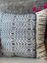 This cotton pillow is made from handwoven ikat in Bali, Indonesia. The pattern is created by painstakingly wrapping the warp of the loom in threads to resist dye - basically a complex tie dye technique - and then rethreading the warp onto the loom and hand weaving.