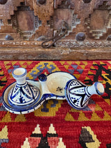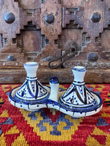 Hand painted in Safi, Morocco, this small double tagine is a lovely tabletop treasure. Perfect for salt and pepper tabletop - or keep different spices or tiny treasures under their jaunty pointed tops.