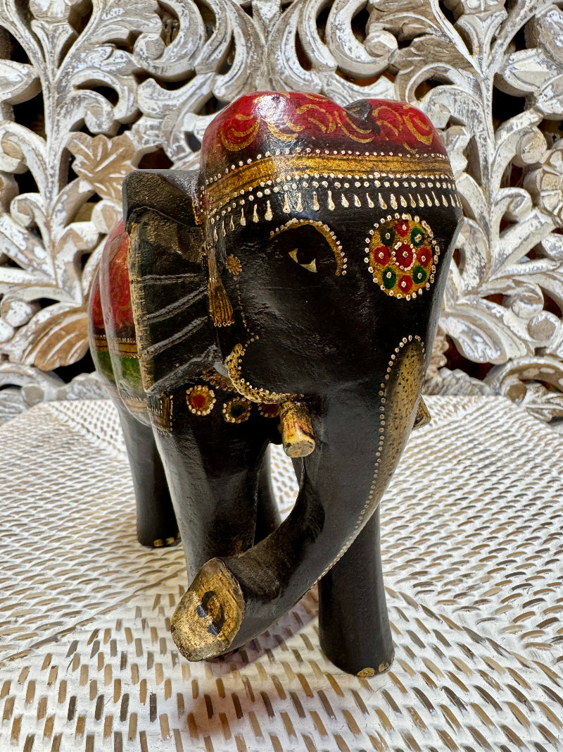 Hand carved out of solid wood and delicately painted in traditional motifs, these elephants are small works of art. The detail on the saddle blankets with its golden birds, and the intricate fringe on the headpiece are exquisite.