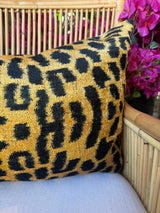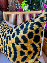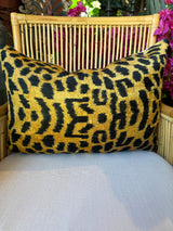 A graphic jaguar pattern in silk velvet ikat is a wild and wonderful way to add a little animal print into your world.  This lumbar pillow is soft to the touch but brings some serious style to your living room or bedroom.