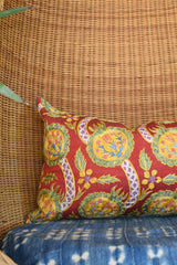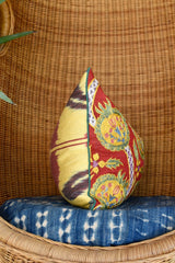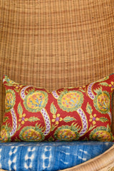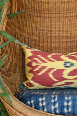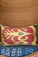 This vibrant suzani pillow has a hand embroidered silk Ottoman design over vivid red silk on the front side, and beautiful silk ikat on the reverse. Hand made in Uzbekistan - we source these stunning pillows from Istanbul. They are truly works of usable art - the soft silk works wonderfully on sofas or beds.