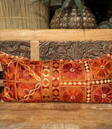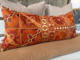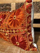 This stunning pillow is from Rajasthan, India and is covered in intricate hand embroidery. It has vivid oranges and floral motifs and is backed in a neutral cotton with a full zip. Absolutely gorgeous front and center on a bed or sofa.