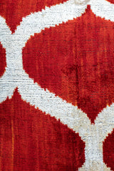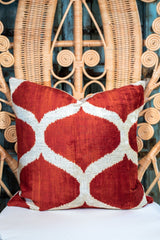 Silk ikat is an incredibly labor intense textile process from Central Asia. The warp is hand tyed to resist dye in places, creating the pattern that is revealed in the weaving process. Luxurious silk threads are used for a soft, sumptuous feel. The additional work of hand cutting each thread to make the silk velvet on these adds yet another level of beauty to these pillows. The reverse is a neutral cotton, hidden zipper at the back.
