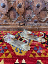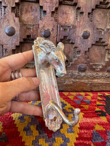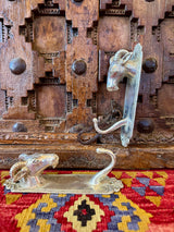 These wall hooks are cast in bronze with a silver finish. They have decorative ram heads with curling horns and an ample hook for coats and hats.