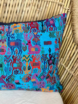 This vibrant turquoise pillow is made from a vintage huipil sourced in the markets of Chichicastanego in Guatemala.  Huipils are traditional shirts that are painstakingly hand embroidered and worn still by women in villages all over Guatemala.