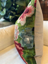 This stunning floral pillow is made from a vintage kilim rug from Moldova.  The bold roses stand out against verdant green abstract foliage.  Neutral cotton back and hidden zip  - front is woolen.  Each pillow has slight variations as they are cut from similar, but separate parts of the same vintage kilim rug.